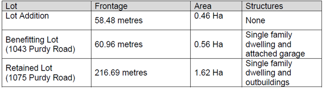 The lot addition (parcel to be transferred to 1043 Purdy Road) has an area of 0.46 hectares with 58.48 metres of frontage along Purdy Road. The benefitting lot (1043 Purdy Road) has an area of 0.56 hectares and 60.96 metres of frontage along Purdy Road and currently contains a single-family dwelling and attached garage. The retained lot currently has an area of approximately 2.08 hectares with approximately 275.17 metres of frontage along Purdy Road and currently contains a single-family dwelling and outbuildings. The resultant lot will have an area of 1.62 hectares and a frontage of 216.69 metres. The lot addition is intended to house a detached workshop. Refer to the key map below.