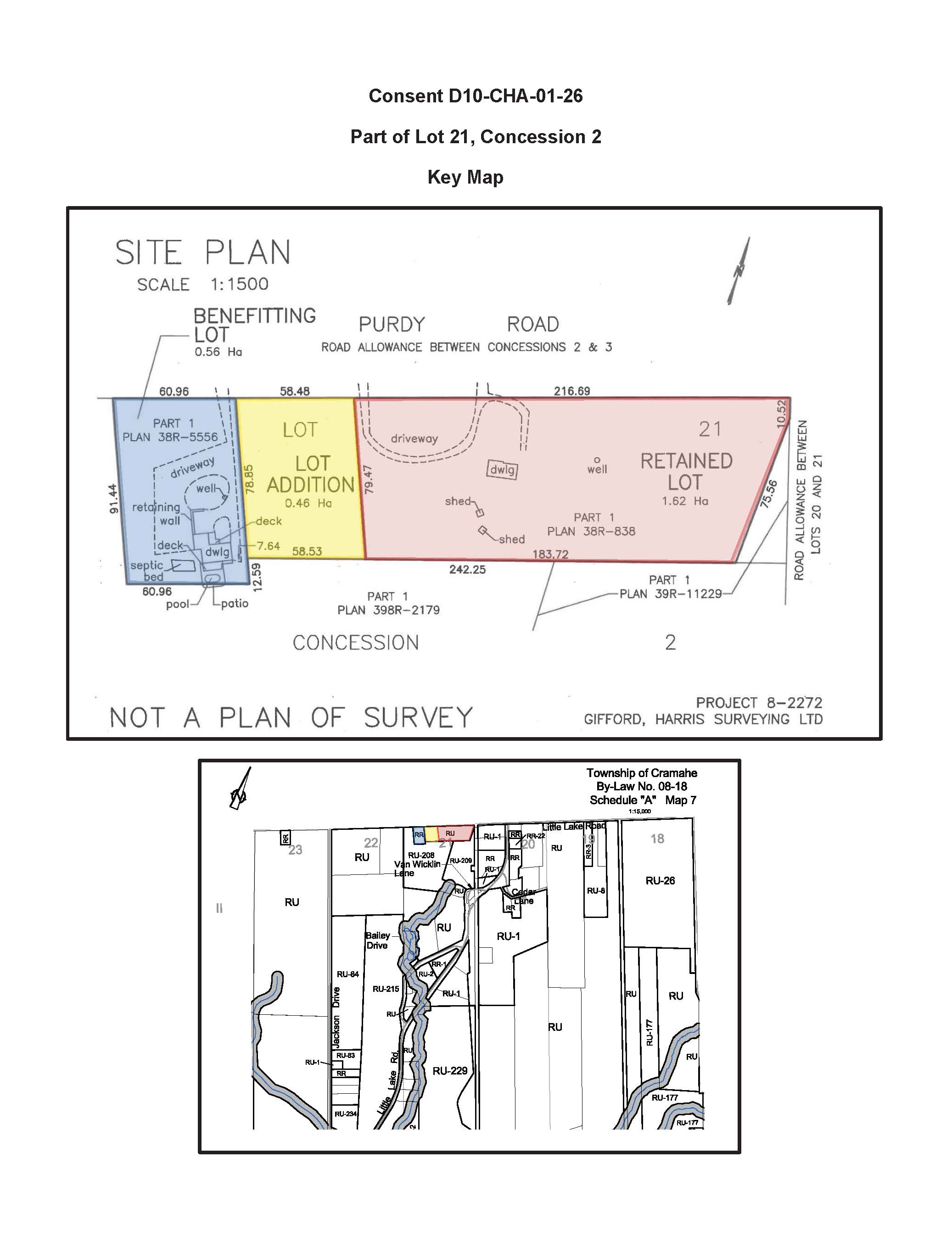 The lot addition (parcel to be transferred to 1043 Purdy Road) has an area of 0.46 hectares with 58.48 metres of frontage along Purdy Road. The benefitting lot (1043 Purdy Road) has an area of 0.56 hectares and 60.96 metres of frontage along Purdy Road and currently contains a single-family dwelling and attached garage. The retained lot currently has an area of approximately 2.08 hectares with approximately 275.17 metres of frontage along Purdy Road and currently contains a single-family dwelling and outbuildings. The resultant lot will have an area of 1.62 hectares and a frontage of 216.69 metres. The lot addition is intended to house a detached workshop. Refer to the key map below.